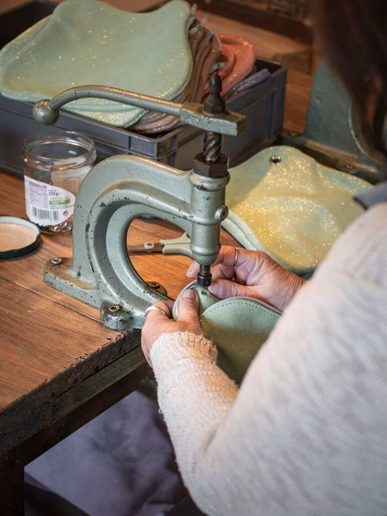 « Des créations colorées et pétillantes fabriquées en France avec le souhait d’égayer la maroquinerie tout en conservant son savoir-faire traditionnel. » C’est ainsi que Sophie Lemoalle Bertholon définit sa marque de maroquinerie dont le cuir pailleté est l’ADN. « Les paillettes sont incrustées à chaud dans le cuir de bovin sourcé auprès d’un partenaire italien certifié Gold par Leather Working Group (LWG), une technologie qui permet une finition résistante et durable. Le cuir pailleté que nous utilisons est une refente de cuir de bovin, côté chair, ce qui permet d’obtenir une texture particulièrement souple et agréable au toucher. »