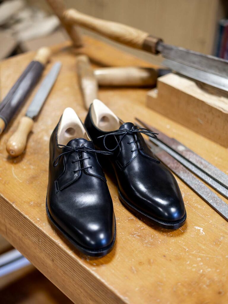 Ce savoir-faire traditionnel exigeant est fondé sur la maîtrise précise des gestes du métier – sculpture des formes en bois, étape essentielle du sur mesure permettant de reproduire fidèlement le pied du client, patronage, montage entièrement réalisé à la main, patine…