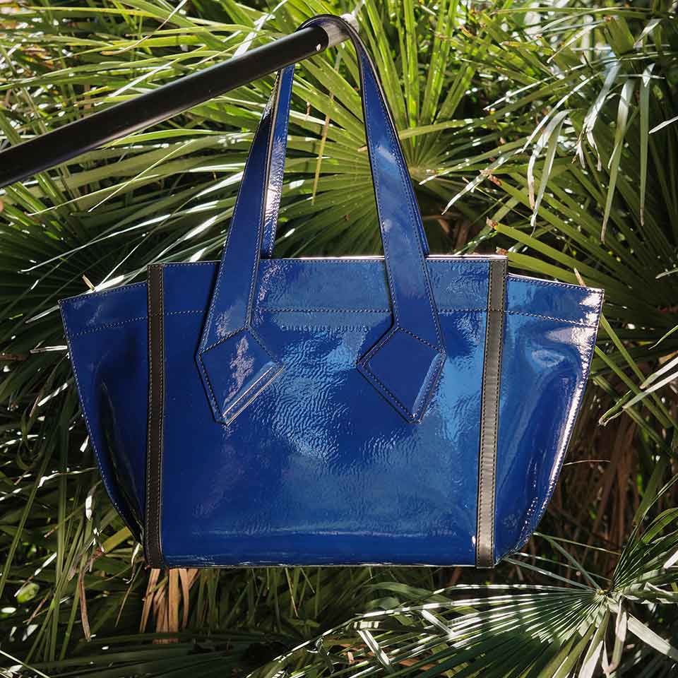 Le pilier de sa collection cuir est un cabas créé en collaboration avec Morgan Diguerher, designer freelance ami de longue date rencontré chez Vanessa Bruno, où ils travaillaient tous deux. « Morgan a analysé mon ADN de marque et compris, outre ma quête de la fonctionnalité, que j’aimais les articles architecturés et minimalistes. » Le résultat : un cabas aux formes épurées et géométriques. Ses anses, finies par des enchapes en forme de losange (pattes de fixation), confèrent, selon la créatrice, « toute sa force au modèle. Ce losange légèrement déformé, impulsant un certain aérodynamisme, fait écho à tout mon travail sur les découpes et autres patchworks géométriques », souligne-t-elle.