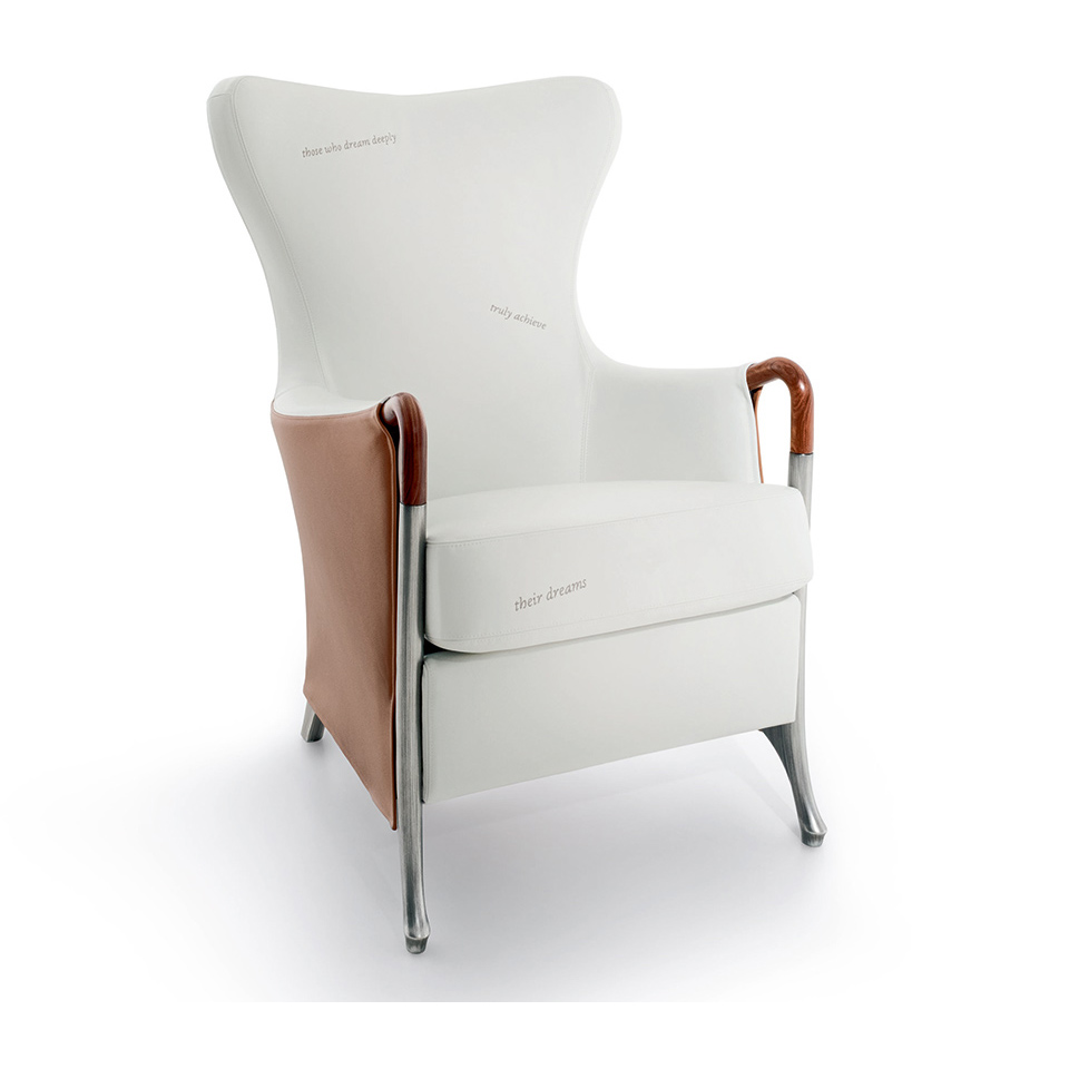 Avec le fauteuil Progetti Special Edition, Giorgetti invite à la poésie. Les mots brodés sur cuir sont entièrement personnalisables.