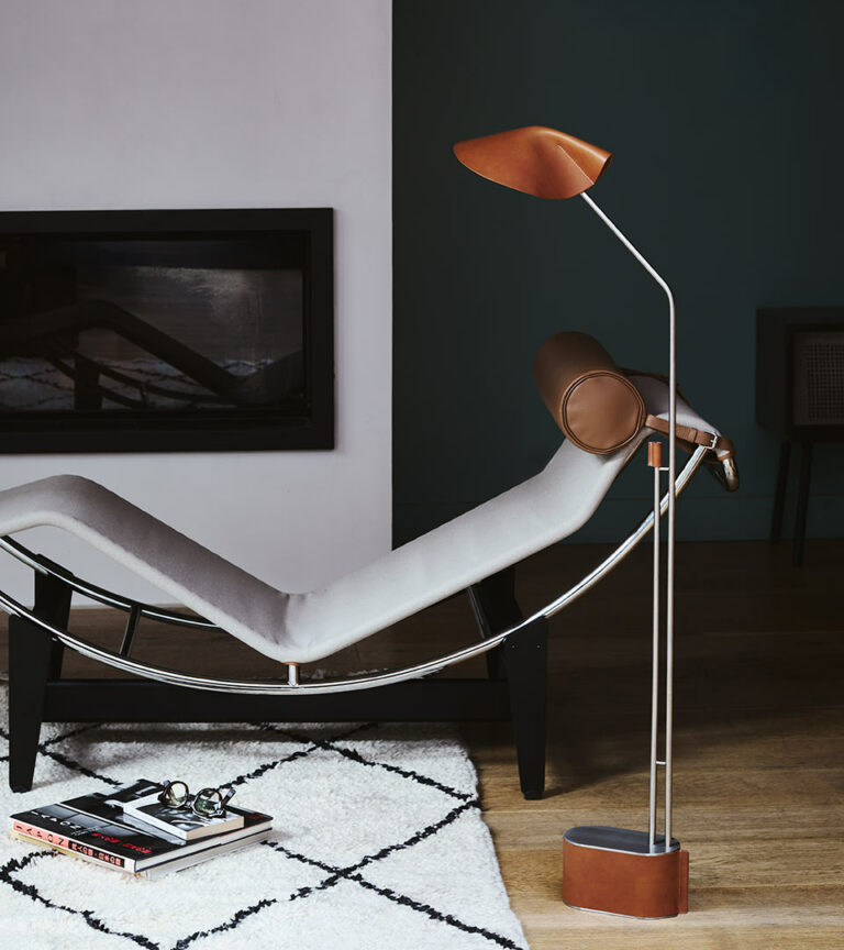 Le spécialiste de la lumière H.isle se prononce « Achille », du nom du designer Hervé Isle, qui l’a cofondé il y a trois décennies. L’éclairage innovant couplé à une dimension sculpturale est sa marque de fabrique. Pico d’Yves Lecointre ne fait pas exception à la règle. Le designer industriel basé en Bretagne collabore pour la première fois avec H.isle. Passionné par les savoir-faire, le diplômé de l’ENSCI-Les Ateliers est convaincu que « le luminaire fait partie intégrante du mobilier. L’éclairage doit être précis, net ». Yves Lecointre est ainsi parti d’une mise en volume par pliage. Pour l’abat-jour des trois pièces de sa série – lampe de table, de bureau et liseuse -, il a porté son choix sur le cuir « à la fois souple et structuré ». Une première tant pour lui que pour l’éditeur français. « Le cuir est un matériau sensible, ajoute-il. Il s’accorde parfaitement à la rigueur minimale de la ligne. » Le cuir tannage végétal a été sélectionné au sein de la tannerie Arnal. Il prend appui sur une tige et une base en inox. « Pico joue avec la matière tout en étant au service de l’usage », poursuit le designer, qui a lui-même réalisé les coutures au point sellier de ses luminaires. Maison Fey, dont l’atelier showroom est situé au Viaduc des Arts, est une autre référence en matière d’artisanat d’art hexagonal. Le gainier parisien depuis 1910 a étendu progressivement son expertise pour devenir maroquinier d’ameublement au sein du groupe Atelier d’Excellence. L’ébénisterie et la tapisserie des pièces d’ameublement sont respectivement réalisées par Siegeair et DGM Signature. Chacun a été mis à contribution dans la première collaboration design avec Loudupala. La collection de mobilier emprunte à la Méditerranée son nom Corniche. Si le bois rappelle les techniques de la charpenterie navale, il dialogue aussi avec le cuir. Notamment sur le buffet Castellar, véritable pièce maitresse, dont le volume monobloc donne pourtant l’impression de flotter dans l’espace… Ses façades entièrement habillées de cuir mêlent écailles marines et vagues sinueuses. La découpe minutieuse du cuir et son gainage sont l’œuvre de Siegeair. Le duo Lily et Léa a, au préalable, tissé manuellement le cuir.