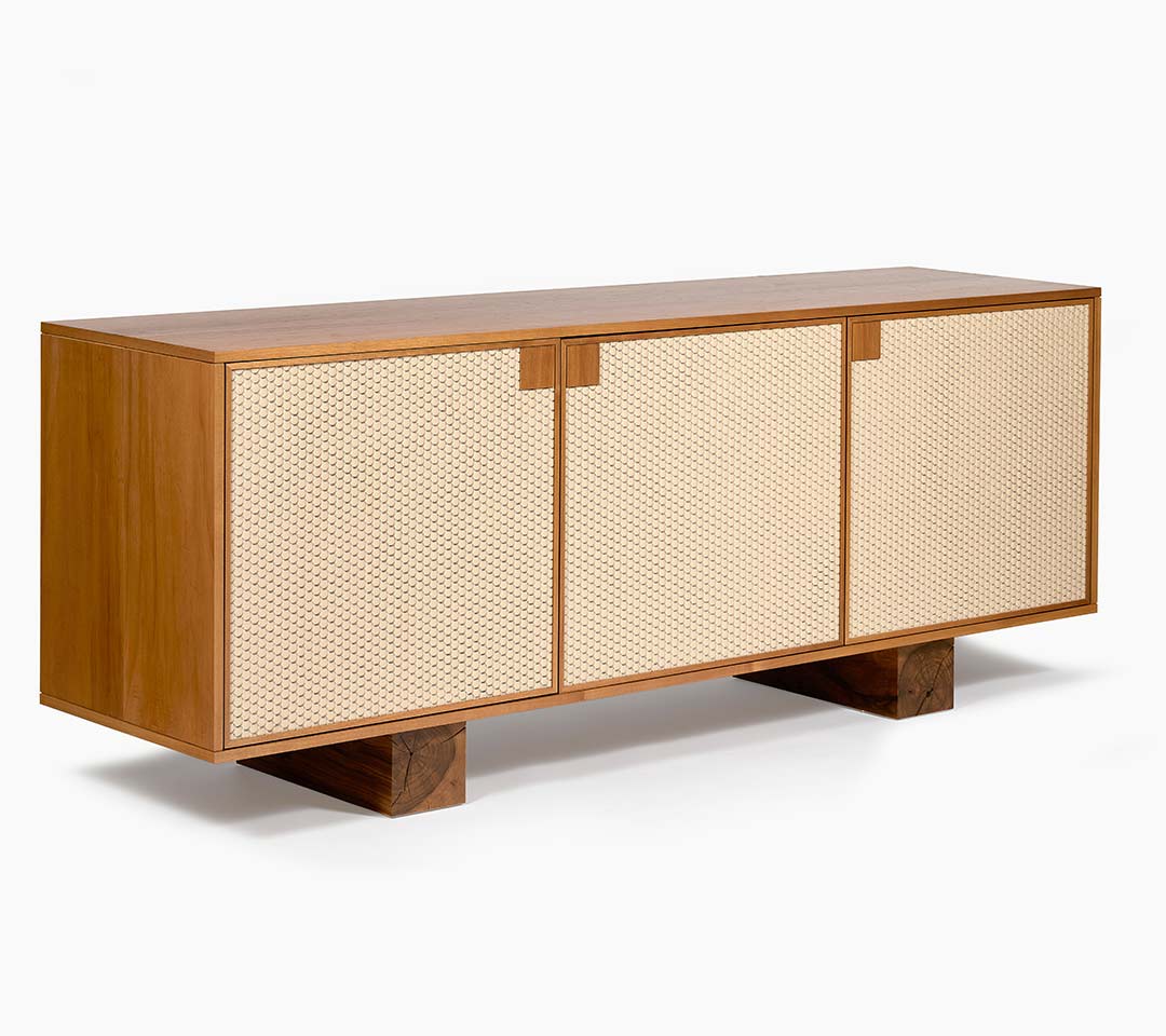 Le buffet Castellar est la pièce phare d’une collection de mobilier réalisée par Maison Fey et Loudupala. Les portes sont gainées d’un tissage de cuir.