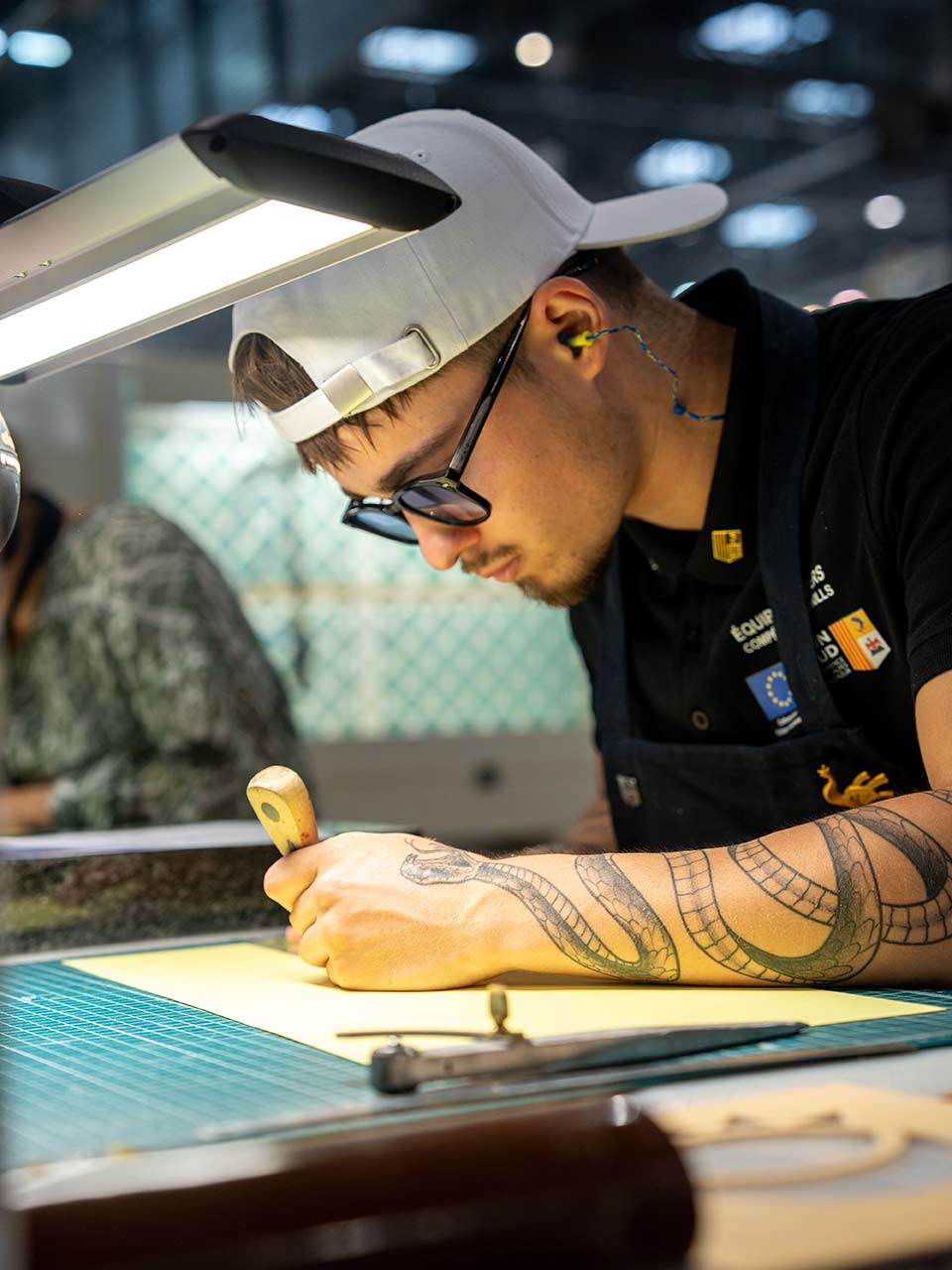 Formé chez les Compagnons du Devoir après un Baccalauréat en Gestion Finance, Killian Pacot a gravi les échelons un à un. D’abord ouvrier en production, il a rejoint un bureau d’études où naissent les prototypes puis l’atelier d’une grande maison de luxe où il a réalisé de A à Z des pièces uniques. À cet égard, le vice-champion se dit d’ailleurs marqué par son maître David Hanna qui a su lui transmettre son exigence et sa passion de Meilleur Ouvrier de France. Aujourd’hui responsable de production de l’atelier en Thaïlande de son oncle qui lui a fait découvrir la maroquinerie, Killian Pacot met aussi à profit ses aptitudes managériales et de leadership auprès d’un effectif de 150 maroquiniers. Il ne s’est d’ailleurs pas privé d’encourager les jeunes venus l’observer aux Worldskills « d’oser, d’essayer, de découvrir ce qui les anime. Trop souvent sous-estimés, les métiers manuels sont pourtant des métiers d’avenir. Ils exigent autant de rigueur intellectuelle que de dextérité. Un ouvrier est à la fois un homme de main et de savoir, un créateur qui allie technique et passion ». Pour le candidat de la région Sud-Provence-Alpes-Côte d’Azur, toujours fasciné par la « transformation d’une peau animale en produit unique, pensé, dessiné et façonné avec soin », le maroquinier n’est au demeurant rien moins qu’un artiste.