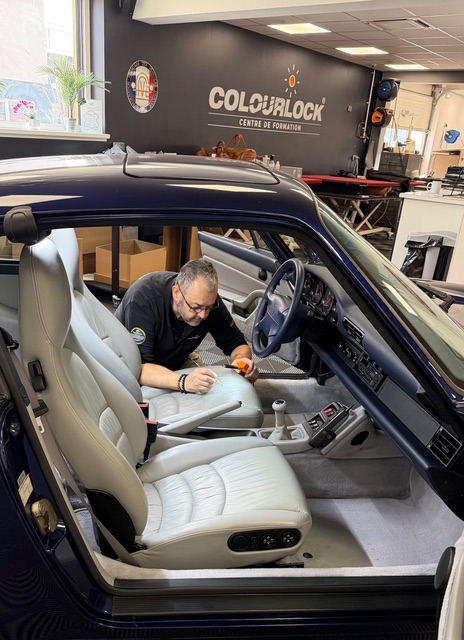 Christophe Magy peut dire qu’il connaît l’automobile de fond en comble. Commencée en 1983 comme apprenti en mécanique dans un petit garage familiale, sa carrière l’a ensuite conduit chez BMW où il a été technicien pendant quinze ans puis chez Audi. Chez un concessionnaire Renault, il s’oriente vers la réparation des carrosseries. Et en 2011, il crée sa propre société d’entretien et esthétique automobile dans la bourgade de Mundolsheim, à quelques kilomètres de Strasbourg. « Mais je me suis rapidement aperçu qu’il y avait un sujet spécifique au cuir dans l’automobile. Les demandes pour les intérieurs en cuir affluaient. Alors en 2015, j’ai décidé de me spécialiser dans la restauration du cuir et j’ai vendu la partie carrosserie de l’entreprise », raconte ce passionné de voitures depuis l’enfance. De l’entretien courant (nettoyage en profondeur, nutrition, protection) à la création complète d’une sellerie, en passant par la réparation d’une griffure ou une déchirure, la recoloration ou le remplacement de parties abimées, l’atelier Renov’Cuir assure tous types d’intervention sur les intérieurs de voitures anciennes de collection comme de vieilles Bugatti, Jaguar ou Bentley ou de bolides actuels de marques de renom comme Maserati ou Porsche dont il est l’un des grands spécialistes. « Le travail peut prendre trois heures s’il s’agit d’un simple soin jusqu’à 400 heures pour une transformation complète avec personnalisation d’un aménagement intérieur, détaille-t-il. Mais dans 80% des cas, on peut se contenter d’une réparation avec un gel colmateur invisible puis une repigmentation sur mesure. Avec un pistolet qui pulvérise de micro gouttelettes reproduisant la structure du cuir, on reconstitue la couche superficielle. On peut aussi utiliser un additif qui reproduit un toucher aniline pour donner plus d’authenticité à la sellerie. » Pour réaliser tous ces prodiges, Christophe Magy est bien aidé par les 200 références de la société allemande Colourlock – kits de coloration et réparation, lotions protectrices, nettoyants divers, graisses nourrissantes, tampons abrasifs ou à lustrer, etc. – dont il maîtrise parfaitement l’utilisation. Au point d’être devenu en 2016 le formateur agréé de la marque pour la zone francophone allant de la France bien sûr au Maghreb en passant par la Suisse, la Belgique et le Luxembourg. « Les sessions durent une semaine, pour une à trois personnes. Le premier jour est consacré à la théorie et les autres jours, à la pratique, sur des exemples concrets présents dans notre atelier », déclare celui qui a participé au développement de la gamme Colourlock. Quant aux cuirs, la plupart du temps pigmentés mais aussi parfois aniline et auxquels il attache la plus haute importance, il les achète également à la société Sofic Cuir.