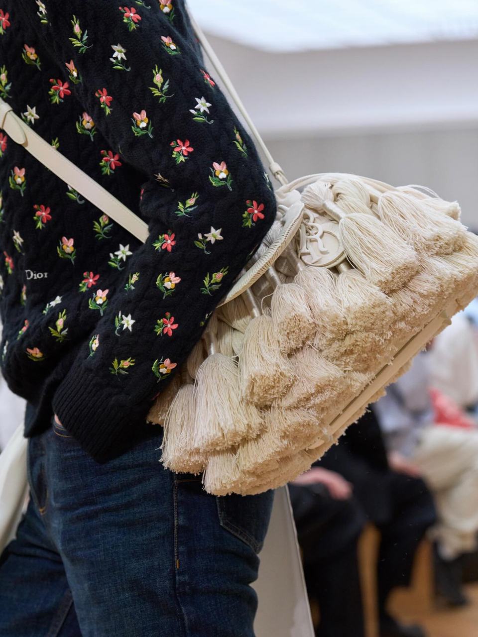 Gianfranco Ferré, John Galliano, Raf Simons, Maria Grazia Chiuri, et aujourd’hui J.W. Anderson pas un des directeurs artistiques de la marque qui ne se soit intéressé au potentiel et à la légende Lady Dior. Initialement proposé dans sa version la plus classique, en agneau matelassé, il est l’objet, au gré des collections et des inspirations, de multiples variations de matières, textiles : crêpe de satin frangé, raphia, tweed, drap de laine, denim, tartan, toile de Jouy (là encore un motif récurrent du vocabulaire Dior) … mais aussi diverses peausseries : veau vernis, veau lisse, crocodile, python, vachette cloutée… Et c’est aussi pour la maison de couture un vrai support d’expressions, et d’impressions, en filiation directes avec les motifs des collections, tantôt les croquis d’Andy Warhol (prêt-à-porter automne-hiver 2013-2014 par Raf Simons), tantôt la reproduction des œuvres de Niki de Saint Phalle (prêt-à-porter, printemps-été 2018, par Maria Grazia Chiuri), ou en veau imprimé du motif « Gazette » (rebaptisé depuis « Newspaper ») comme une citation directe du Dior période Galliano et commercialisé actuellement.