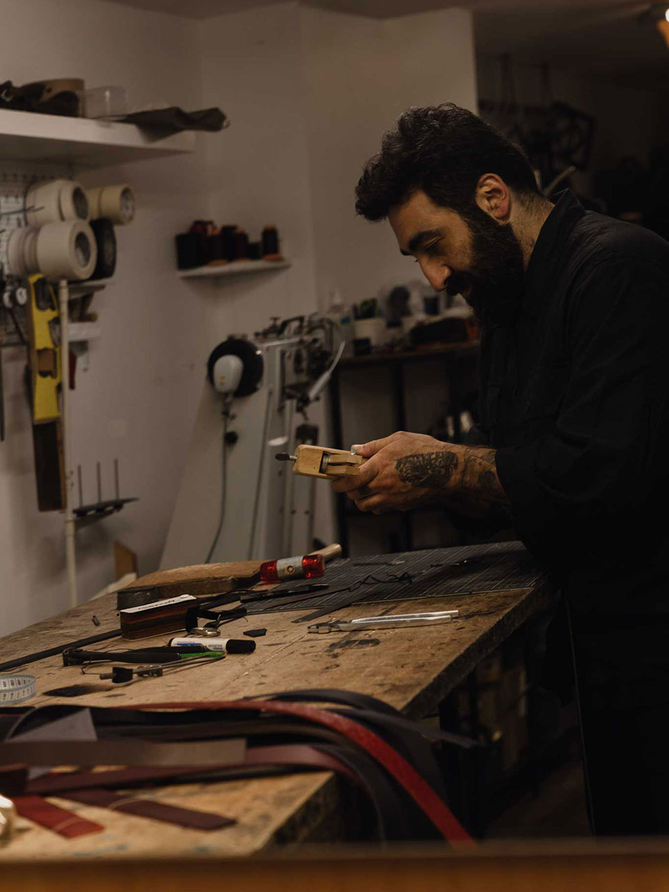 Travaillée à partir de cuirs à tannage végétal sourcés en France auprès des maisons Chadefaux, Fichet et Sofic, chaque pièce – sac, ceinture, petite maroquinerie – est réalisée à la main en valorisant des techniques transmises de génération en génération. Hagop Markarian designe des modèles minimalistes et intemporels conçus avec un minimum de pièces et le plus souvent sans doublure, « des collections signatures inspirées de thèmes plus que des saisons ou des tendances ». Ces créations artisanales, durables et réparables, peuvent être entièrement personnalisées : choix du cuir directement dans l’atelier, du fil, des accessoires, des finitions, de la gravure… « Les clients apprécient que l’on co-créé ensemble des pièces uniques », se réjouit-il.