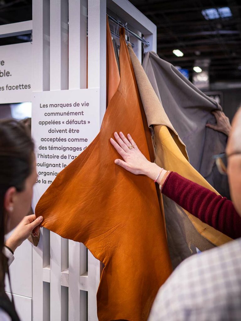 Les acteurs de l’amont de la filière sensibiliseront le grand public, les éleveurs, les institutionnels et politiques aux enjeux majeurs du secteur à travers un parcours didactique. La filière entend ainsi mettre en lumière la diversité des cuirs, les innovations (cuirs tactiles, lavables, stretch) et des territoires via la transformation d’un produit brut en une matière noble et durable grâce à des savoir-faire ancestraux et innovants.