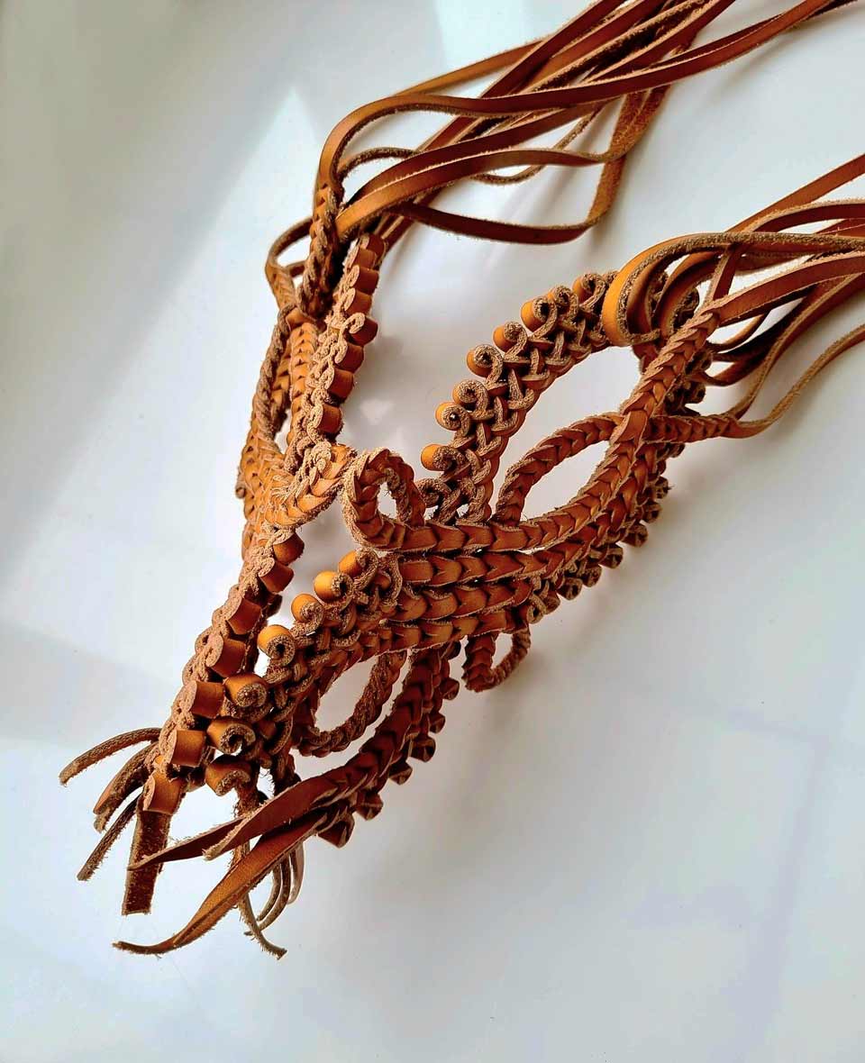 Fidèle à sa pratique, la sellière repousse les limites de la tradition, insufflant créativité, liberté d’exécution. Et si le Shallang était à l’aube d’une nouvelle esthétique ? Sofia Shazak en est sûre. « Je veux faire connaître cette technique pour l’enseigner et la transmettre », affirme-t-elle. Pour la lancer, elle n’a pas choisi au hasard l’écrin Maison d’Exceptions (MEX), dédié aux savoir-faire rares d’artisans d’art innovants. Sur son stand, Bakany était sans conteste une pièce maîtresse. Avec ses 60 heures de travail, elle a suscité intérêt, curiosité, admiration, sur le salon de Villepinte. « J’ai rencontré des créatifs, des maisons de luxe, commente la créatrice. Les professionnels de la mode semblent très intéressés. Le Shallang, par sa nature ornementale, se prête au bijou, à l’accessoire. Mais d’autres applications sont envisageables car le cuir peut être sculpté en relief. Il est toujours intéressant de transformer le cuir en volume. Il suffit de le tordre, de le retourner par exemple, et la perception change totalement. Les séries répétitives de motifs et de boucles de tressage conviennent tout à fait aux objets décoratifs, aux décors de vitrines aussi. » L’art de Sofia Shazak s’ouvre à toutes les disciplines : mode, art, décoration, design et même cinéma. Les claustras, qu’elle a imaginés avec des éléments et des techniques de sellerie, lui ont ainsi ouvert les portes de l’architecture d’intérieur. La Biennale internationale Homo Faber à Venise (1er-30 septembre) lui offre un nouveau champ d’expression. Pour l’exposition « Twenty Silent Songs » sous la direction artistique d’Es Devlin, une pièce géante de cuir fera revivre le Shallang aux côtés d’œuvres artisanales venues du monde entier.