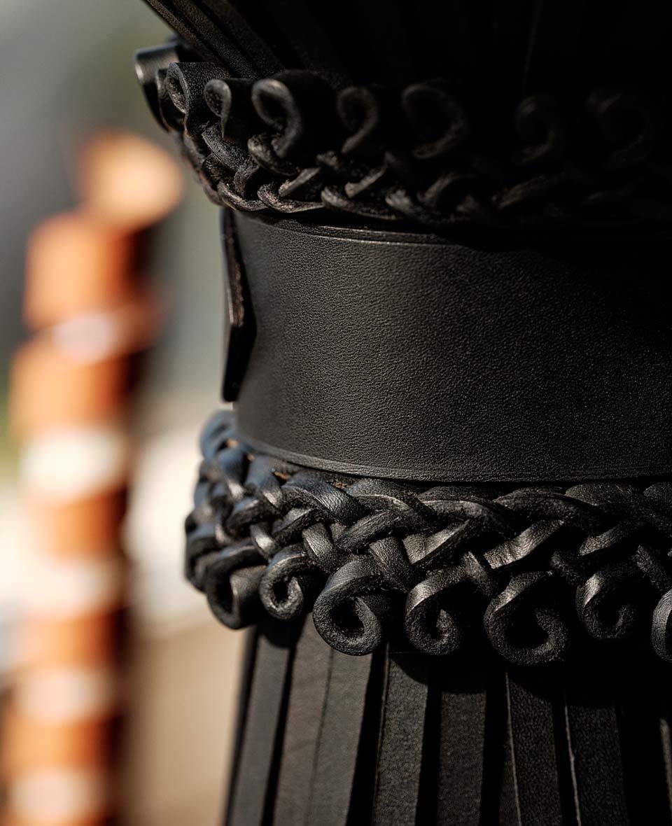 L’équitation a nourri sa passion pour l’art de la sellerie. C’est chez Les Compagnons du Devoir que Sofia Shazak s’approprie le travail du cuir et la maîtrise des gestes. Elle fait ses débuts en 2016 mais tient à préciser que son arrivée, au Jardin des Métiers d’Art et du Design à Sèvres, a marqué une étape décisive dans son parcours. « En 2022, j’ai installé mon atelier au JAD, explique-t-elle. Il est à l’origine d’un écosystème très performant. Comme je n’ai étudié ni les Beaux-arts ni le design, je me suis aussitôt demandé comment utiliser mon savoir-faire et mes techniques de sellerie pour les valoriser artistiquement. Personnellement, je ne fais aucune différence entre l’art et l’artisanat. Je me nourris des deux. » Son atelier est bien sûr spécialisé en sellerie/harnachement équestre mais pas seulement… Le moulage du cuir lui a permis de collaborer avec les créateurs de mode les plus exigeants. « J’aime être stimulée par le rythme, l’urgence, propres aux collections », précise-t-elle. La sellière aux racines russo-tunisienne ne perd pas de vue, pour autant, le rôle majeur de l’innovation lorsqu’elle dialogue avec la tradition. Le répertoire décoratif qu’elle construit, au fil des années, redonne vie, désormais, à un savoir-faire ancien et oublié : le Shallang.