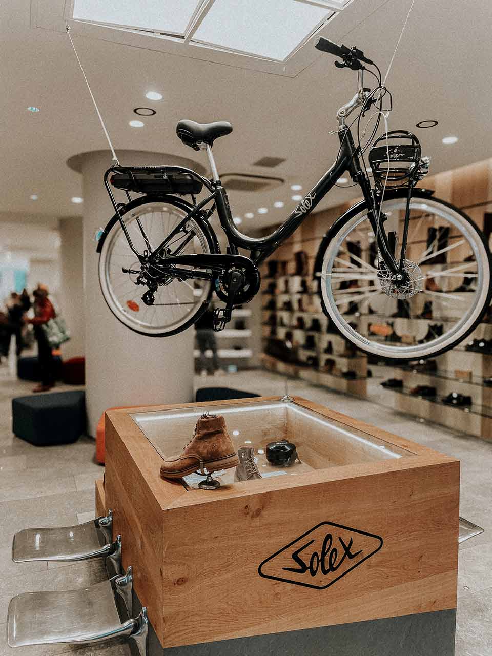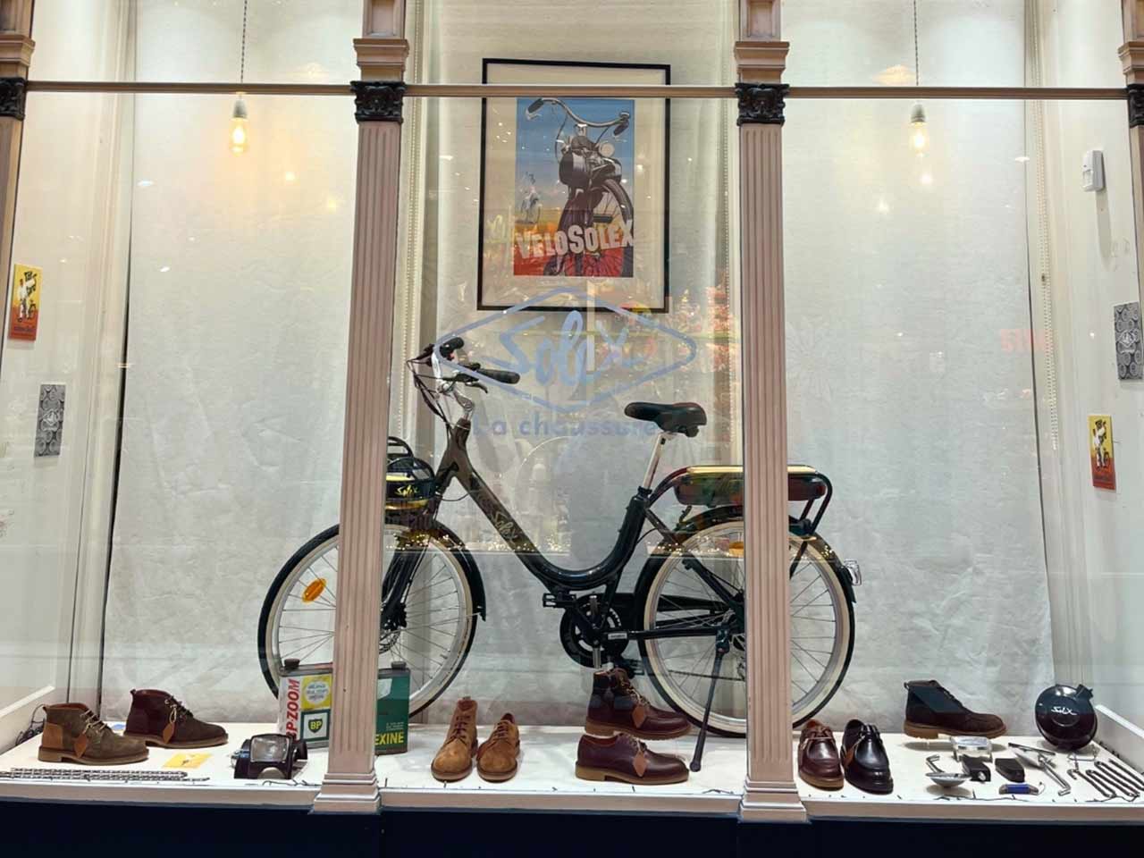 Vitrine à Nantes associant un Solex nouvelle génération avec les chaussures en cuir de la licence.