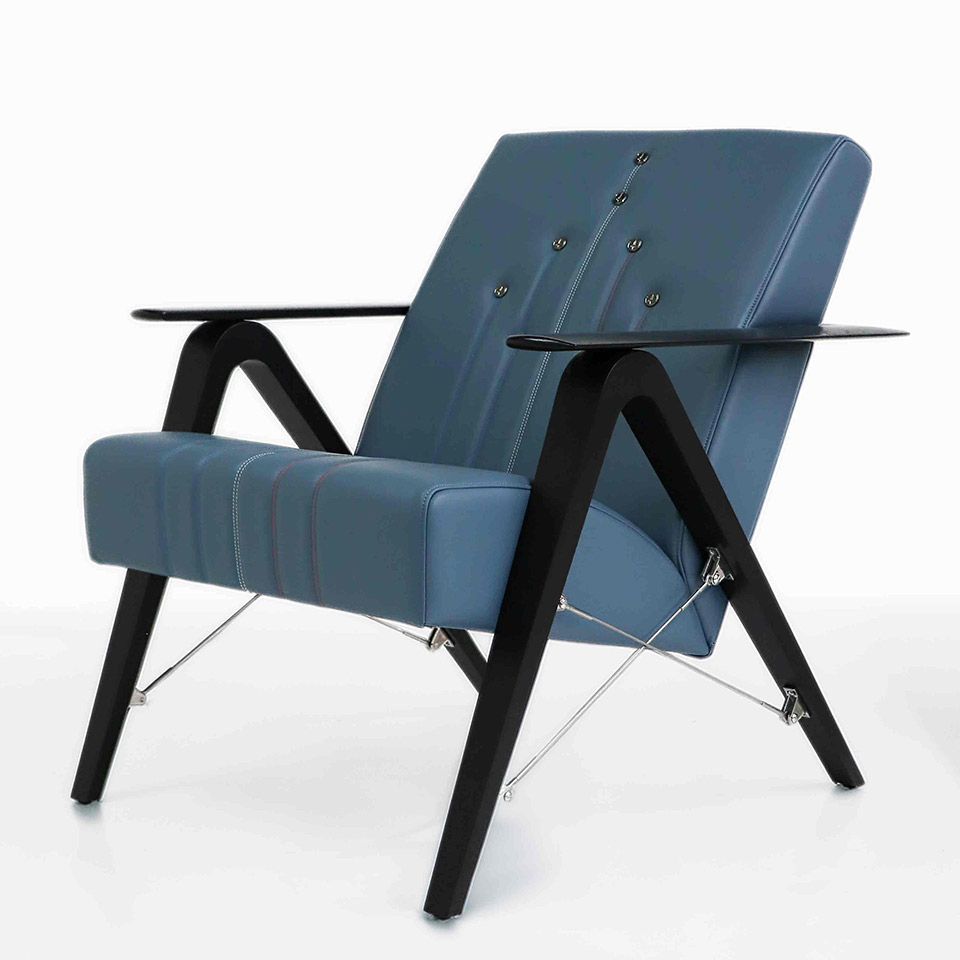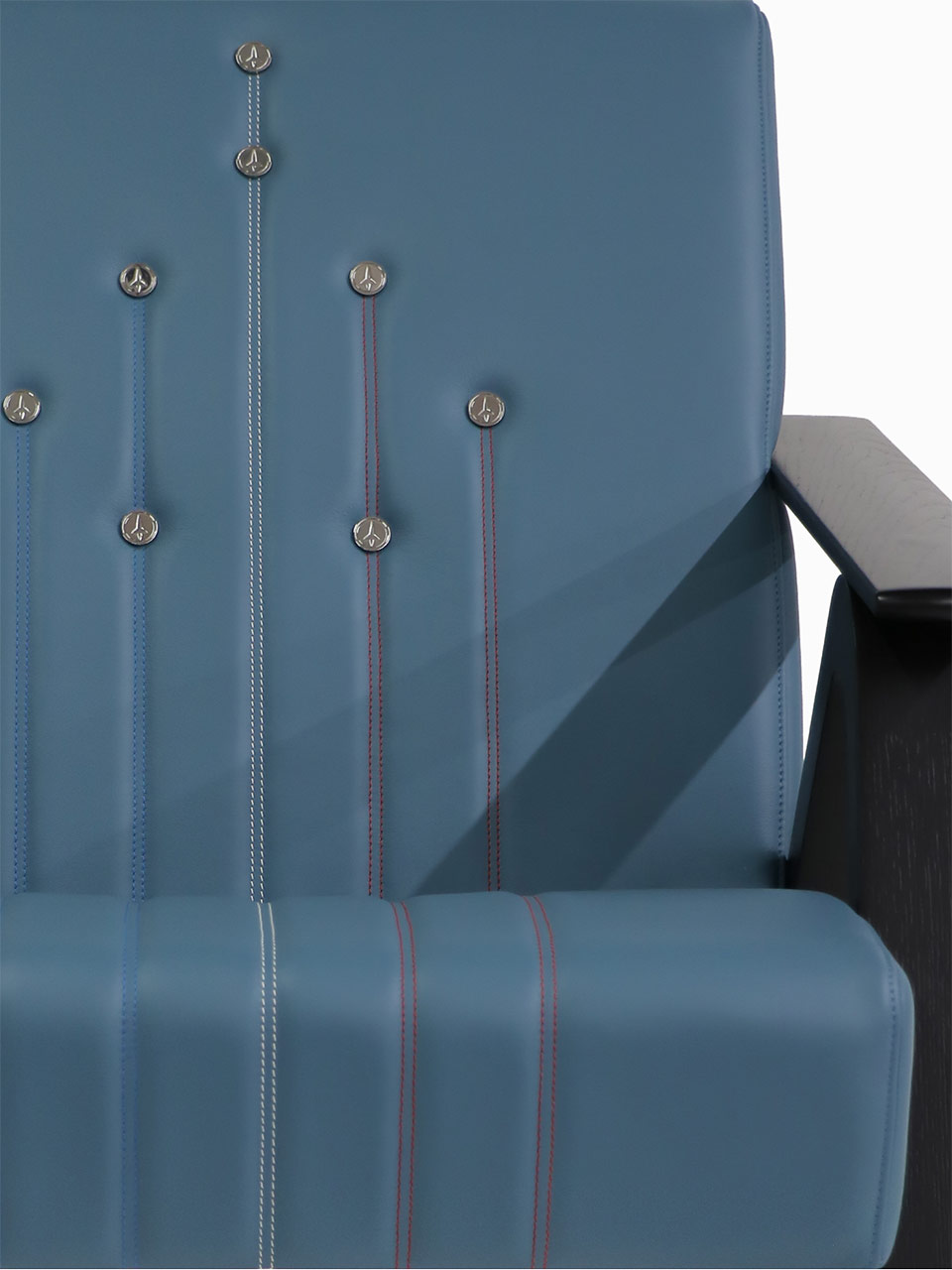 De manière très naturelle. Notre dialogue entre design et savoir-faire artisanal a été constant. Nous avons travaillé étroitement autour des aspects techniques, des choix de matériaux, de la maîtrise du cuir comme de la tapisserie, de la qualité des finitions… L’inclinaison du dossier Athos, par exemple, est celle d’un siège éjectable. Sa sensation proche de la gravité zéro procure un confort optimal. Les accoudoirs en « U », les pieds en « V » inversé sont en lien direct avec la Patrouille de France. Le cuir matelassé et ses finitions rendent hommage à des avions historiques comme le Morane-Saulnier MS230 et Stampe&Vertongen SV-4. Quant au boutonnage, il représente la mythique formation concorde. Les surpiqûres rappellent les fumigènes tricolores qui permettent de tracer les figures acrobatiques dans le ciel.