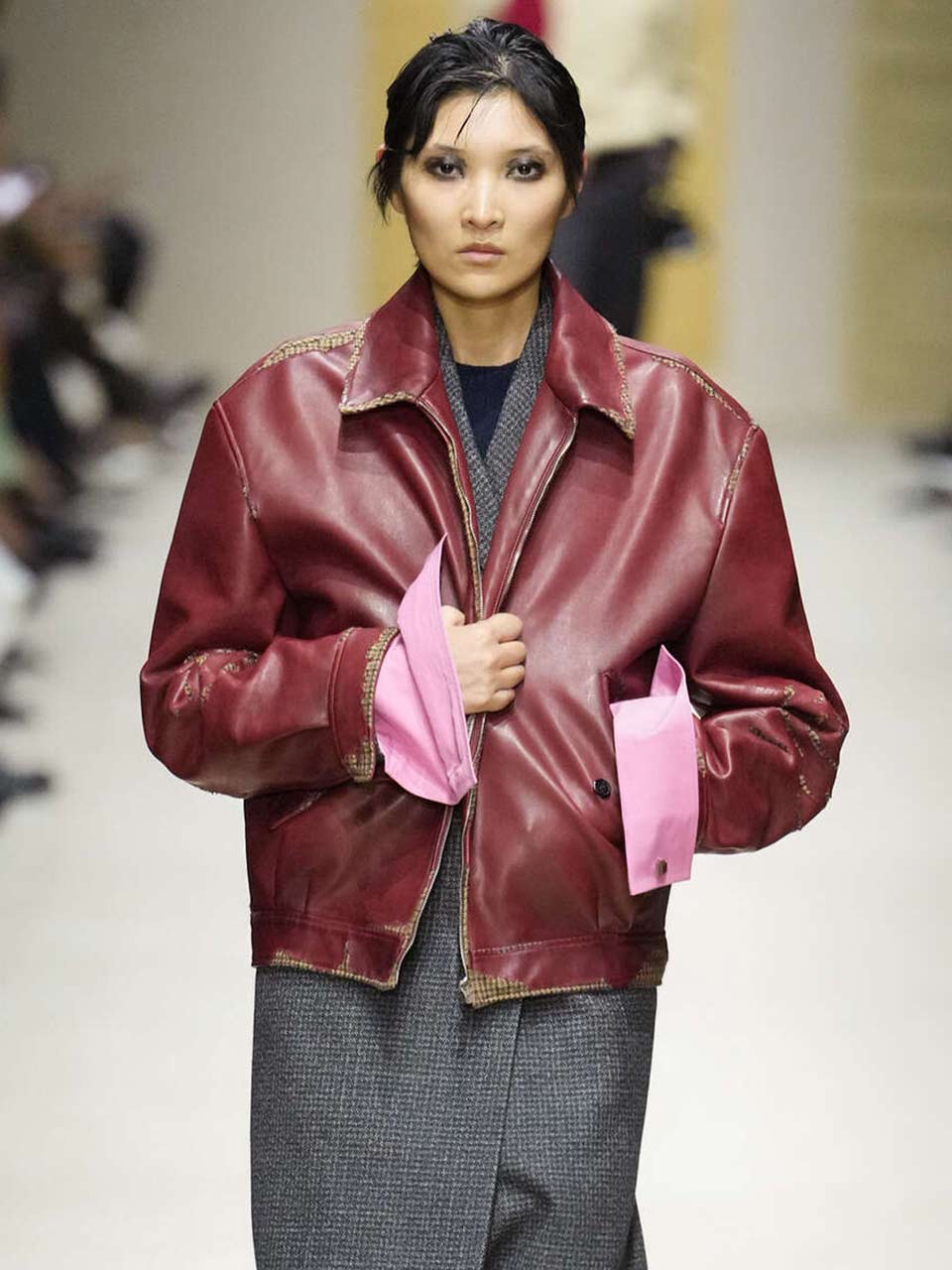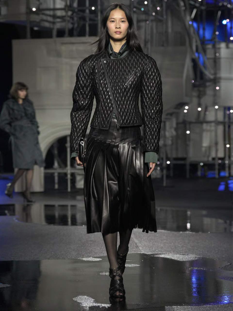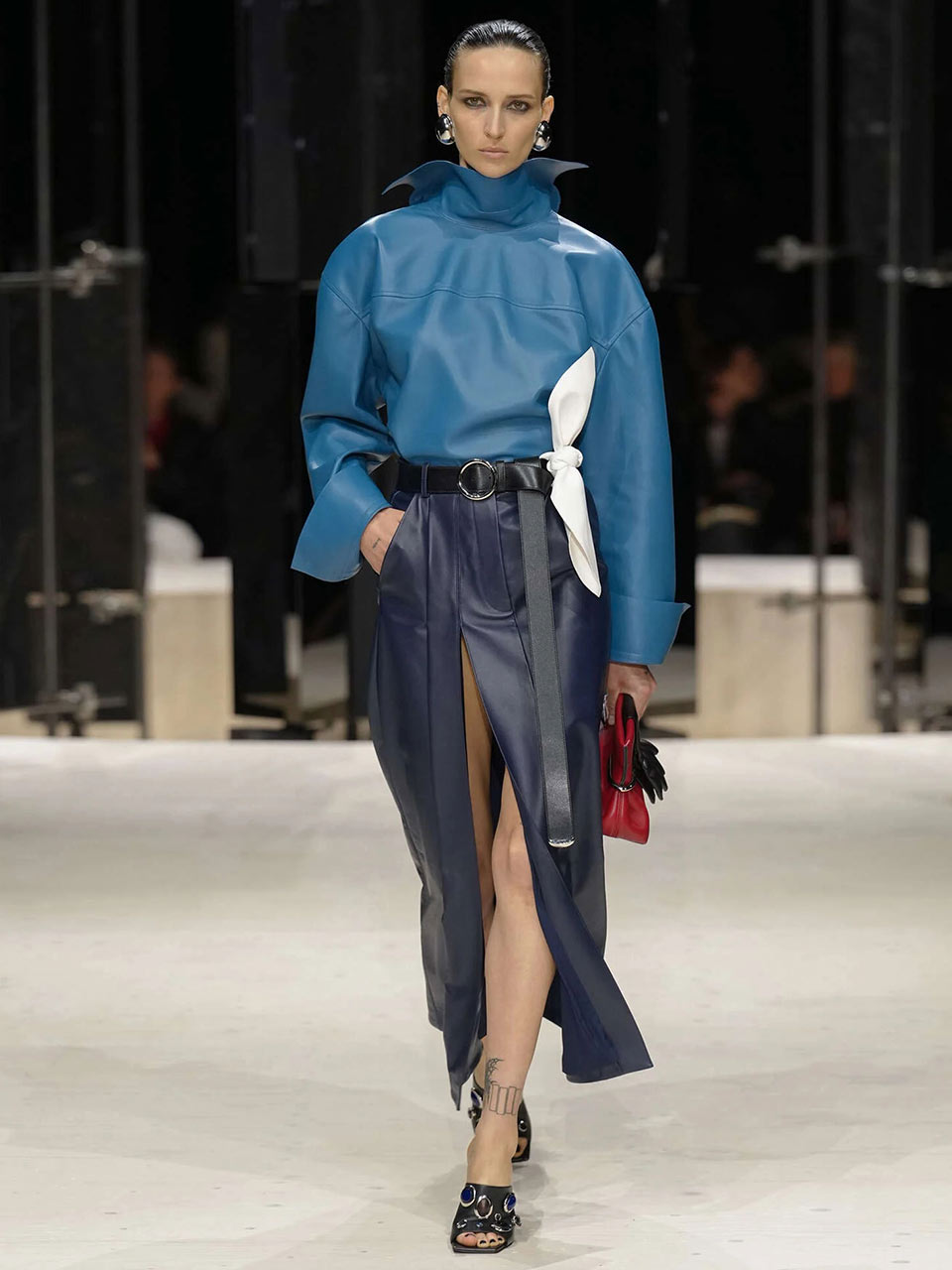 La capitale lombarde affirme son style, entre chic dévergondé et audaces stylistiques, comme chez Prada avec ces effets de dévorés vintage, des superpositions, des hybridations (encore) de cuir et textile. Les belles peausseries se revendiquent et s’affirment comme des items de luxe, autruche ou grain autruche chez Boss, pour des silhouettes à l’esprit tailoring, le retour des gants longs comme une mise en scène de soi (chez Max Mara aussi dans des cuirs suédés). Rigueur graphique chez Maison Margiela avec des constructions de vestes de tailleurs et manteaux chez Jil Sander. C’était aussi la première de Maria Grazia Chiuri, de retour chez Fendi, avec une proposition de mode assez radicale, construite autour du noir. Les fondamentaux de la marque y sont revisités, fourrures aux traitements expérimentaux, sac Baguette, de la fantaisie dans les traitements cuirs avec des cuirs perforés, cloutés, vintage-patinés, brodés… Pour Gucci, Demna Gvasalia continue son travail de « reset » tout en puisant dans les archives et les grandes heures de la marque. Là, il rejoue la partition et l’imagerie sexy (sexuel ?) de la période Tom Ford, silhouettes évocatrices, cuir seconde peau, blousons néo seventies, croco brillant, influence BDSM… Une vision de la mode, plus démonstrative, plus opulente, moins dépouillée aussi, avec les propositions de Missoni, jupe « active-wear » en cuir noir pour une silhouette qui allie sophistiqué et pratique, comme ces longs manteaux de cuir façon trench. Des jupes en intreciatto, des volumes extravagants chez Bottega Veneta, Louise Trotter impose la matière cuir, comme la signature maison, manifeste du savoir-faire historique de la marque.