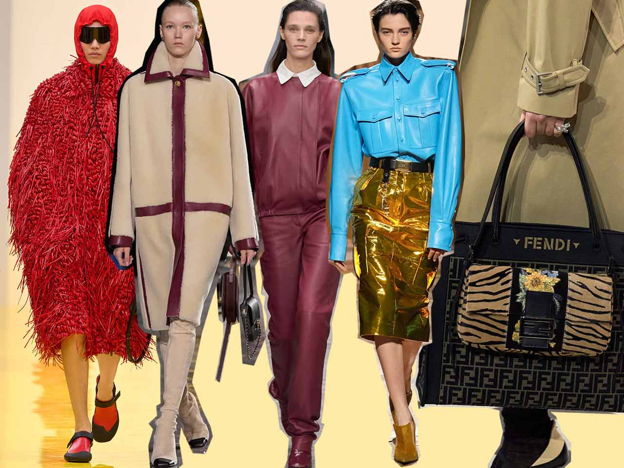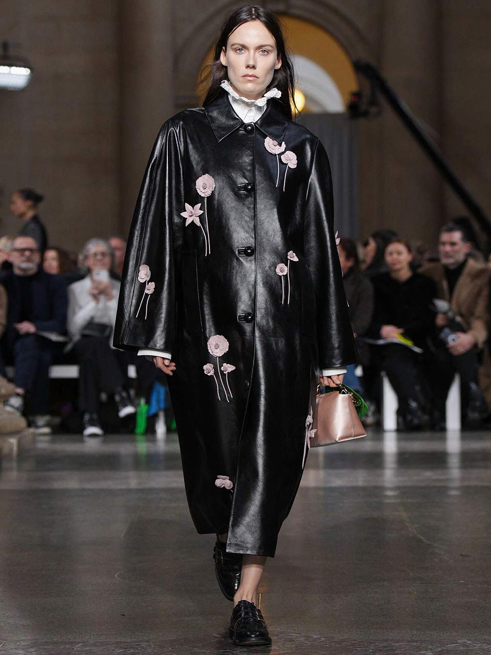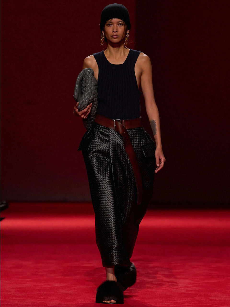 La capitale lombarde affirme son style, entre chic dévergondé et audaces stylistiques, comme chez Prada avec ces effets de dévorés vintage, des superpositions, des hybridations (encore) de cuir et textile. Les belles peausseries se revendiquent et s’affirment comme des items de luxe, autruche ou grain autruche chez Boss, pour des silhouettes à l’esprit tailoring, le retour des gants longs comme une mise en scène de soi (chez Max Mara aussi dans des cuirs suédés). Rigueur graphique chez Maison Margiela avec des constructions de vestes de tailleurs et manteaux chez Jil Sander. C’était aussi la première de Maria Grazia Chiuri, de retour chez Fendi, avec une proposition de mode assez radicale, construite autour du noir. Les fondamentaux de la marque y sont revisités, fourrures aux traitements expérimentaux, sac Baguette, de la fantaisie dans les traitements cuirs avec des cuirs perforés, cloutés, vintage-patinés, brodés… Pour Gucci, Demna Gvasalia continue son travail de « reset » tout en puisant dans les archives et les grandes heures de la marque. Là, il rejoue la partition et l’imagerie sexy (sexuel ?) de la période Tom Ford, silhouettes évocatrices, cuir seconde peau, blousons néo seventies, croco brillant, influence BDSM… Une vision de la mode, plus démonstrative, plus opulente, moins dépouillée aussi, avec les propositions de Missoni, jupe « active-wear » en cuir noir pour une silhouette qui allie sophistiqué et pratique, comme ces longs manteaux de cuir façon trench. Des jupes en intreciatto, des volumes extravagants chez Bottega Veneta, Louise Trotter impose la matière cuir, comme la signature maison, manifeste du savoir-faire historique de la marque.