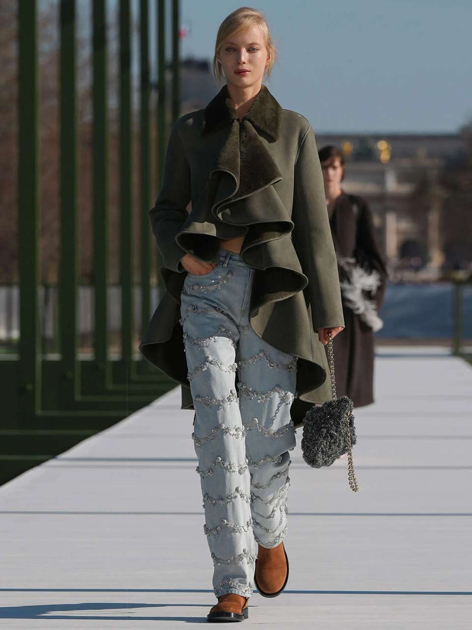 Dénouement et scène finale à Paris, toujours copié, jamais égalé. La capitale exporte depuis des décennies cette image de la Parisienne, cette allure couture « effortless », sophistiquée mais jamais trop apprêtée. Pour elle la mode est une évidence et, cette saison, cette allure de néo-bourgeoise nonchalante est l’attitude à retenir. Travaillé tout en souplesse, dans un esprit flou et moulage, le cuir est traité comme du textile, en volants, plissé, drapé, smocké… comme une blouse de Gazar chez Givenchy, ou une chemise denim chez Mugler. La peau lainée aussi est omniprésente dans les collections, travaillée tout en plis, comme une robe de bal chez Dior, ou plus structurée avec ce passage d’un long manteau chez Chanel. Cuir façon détails couture, des rubans, des nœuds, des micro-pochettes, du python – encore – c’est par touches classieuses et sophistiquées que le cuir s’impose dans la collection Saint Laurent. Chez Balmain, une silhouette au cuir triomphant, souvent en total look. C’est indéniablement la matière phare de cette première collection « post-Rousteing » créée par Antonin Tron. Femme fatale, « glamour toujours » avec les propositions de robes de cuir sculpturales, long fourreau ou « mini-sexy » chez Mugler, Jitrois, ou des silhouettes caparaçonnées de croco ou python vernis chez Tom Ford. « Intello-expérimental-design », avec ces élucubrations cuirs chez Loewe, cuir foamé pour des silhouettes très dessinées, carrossées, jeux de franges de cuirs pour ces manteaux aux volumes impressionnants, des franges, des lanières, des tressages de cuirs que l’on retrouve aussi dans les propositions de Duran Lantink chez Jean-Paul Gaultier ou Louis Vuitton. Look épuré et sans fioriture, allure longiligne avec des blousons de cuir et leggings siglés Courrèges. Même allure graphique chez Hermès, qui réaffirme le cuir comme matière incontournable de son prêt-à-porter, des bottes qui sont quasiment de tous les passages, des jeux de zips en diagonales sur les blousons et les jupes, des jeux de matelassages, cuir d’autruche aux applications repensées… Autant d’effets qui construisent, et déconstruisent la silhouette, et font de cette proposition de mode du sellier un parfait exemple d’équilibre entre l’intemporel et le moderne.