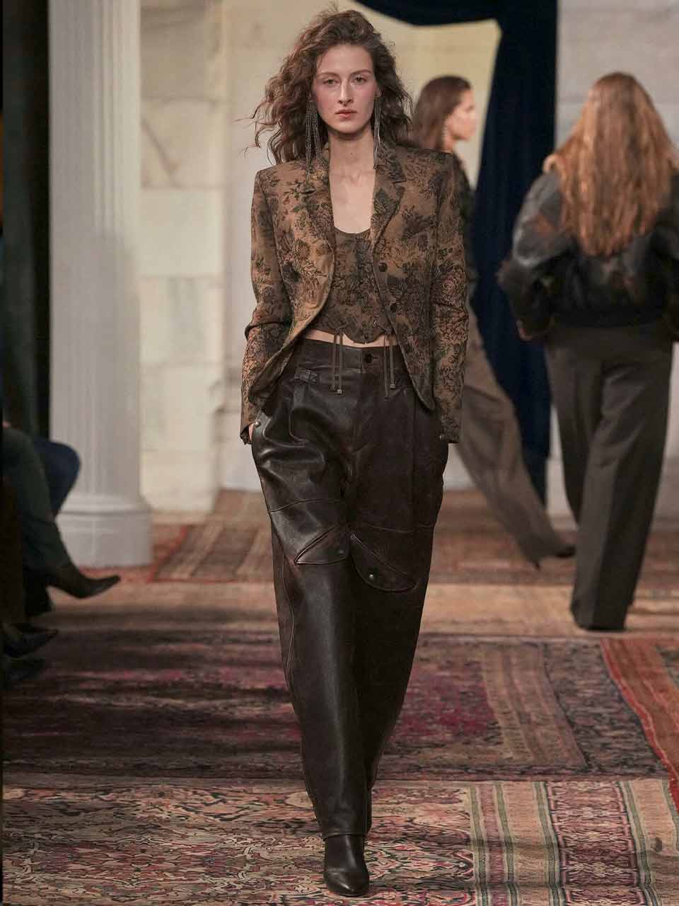 Urbaine et sophistiquée, parée pour toutes les occasions, sur les podiums outre-Atlantique, le cuir est la matière qui marque les esprits, femme fatale comme une seconde peau chez Laquan Smith, même esprit avec ces manteaux en cuir vernis ou aspect vernis chez Tory Burch et Michael Kors. Chez Calvin Klein, c’est une vision et un usage plus dépouillé de la matière, sensuel mais subtil, séducteur mais tout en chuchotement, comme cette combinaison grenat d’où émerge un très sage col de chemise immaculé, camaïeux de blanc aussi avec les accessoires aux lignes design qui renouent avec le minimalisme originel de la marque. Silhouettes graphiques et épurées encore chez Proenza Schouler, avec des trenchs aux effets patinés, ou des mélanges cuir et textile (un effet de style particulièrement présent cette saison). L’ « American Dream » s’invite sur les podiums de ces marques, véritables institutions, qui affirment leur identité et patrimoine. Chez Coach c’est toute l’imagerie universitaire, empruntée aux sports américains, avec des shorts en cuir et sacs façon gant de base-ball, mélanges cuir et denim, blousons en peau retournée façon « Top Gun », ou encore des prints « bannière étoilée »… Démonstration d’une élégance sans ostentation, esprit héritage et évocation d’un ranch glamour, dans une palette d’ocres et de bruns, Ralph Lauren décline, les velours, les tissus tapisseries, les laines chinées qui répondent aux patines des cuirs, des détails équestres, des ceintures et bottes en cuir coupé à cru ponctuent les silhouettes. Même allure intrépide, dans une version peut-être plus casual chez Veronica Beard, avec ces blousons aspects suédés, des grains buffle et peaux lainées travaillées tout en fluidité.