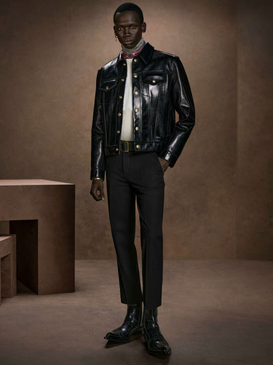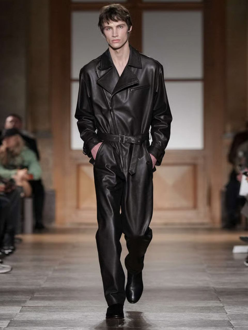Esprit costume et exigence pour des pièces d’exception, mais néanmoins pensées pour une allure casual comme ces blousons avec détails de nœuds façon néo-lavallières, tout croco chez Louis Vuitton, ou une version plus « raisonnable » chez Agnès b. De longs manteaux, façons trenchs, se portent, ceinturés ou pas, et se réinventent version cuir, souvent noirs. Ils allongent en même temps qu’ils structurent les silhouettes, là encore un indispensable du vestiaire automne-hiver 2026-2027, avec les propositions de Prada, Ralph Lauren, Études Studio, Saint Laurent ; moins formel il sait se faire plus romantique chez Ann Demeulemeester… ou encore version nappe d’anguille, hyper graphique chez Dries Van Noten, typologie de cuir que l’on retrouve aussi, au côté du python, dans les accessoires de cette collection. Cette saison, c’était aussi la dernière de Véronique Nichanian pour l’homme Hermès : après 37 années, elle laissera sa place, chez le sellier du faubourg Saint-Honoré, dès la saison prochaine à la britannique Grace Wales Bonner. Elle livre une dernière collection à son image, un vestiaire évident, des pièces éminemment désirables pensées dans des variations de noirs ou de teintes sombres, et plusieurs passages « tout cuir », comme cette combinaison-costume, ou des looks « tout croco »… Le costume, le tailoring, le « bien bâti », c’est tout un vocabulaire et des références de savoir-faire « tailleur » que s’approprie la matière cuir cette saison : costumes tout cuir chez KidSuper, veste croisée cuir chez Steven Passaro, ou total look, cravate comprise, chez David Catalan. Atmosphère lourde et sombre, allure ténébreuse pour les hommes « Alien » de LGN Louis Gabriel Nouchi en blousons noirs ou longs manteaux à effets crispés. Autant d’exemples ici, pour un cuir hyper-graphique et structurant, matière première d’exception pour cette idée d’un luxe aussi indispensable qu’indémodable.