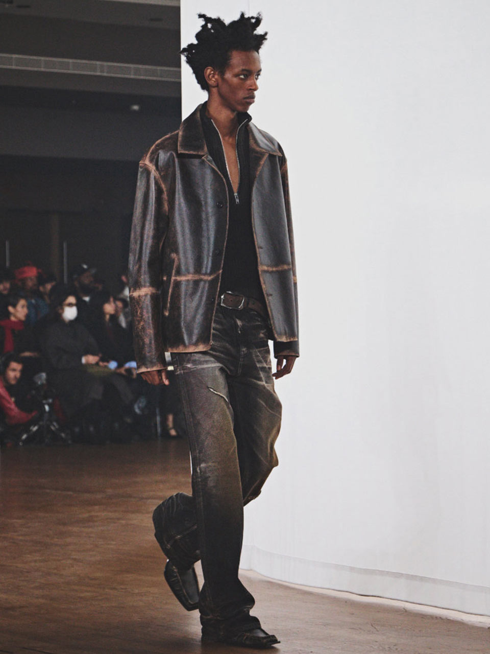 Traces, effets d’érosion, usé jusqu’à la corde, patine vintage (Ralph Lauren, David Catalan, KidSuper), cuir froissé et fripé chez Songzio… des effets qui, cette saison encore, perdurent dans le vestiaire des hommes. Volumes exagérés, épaules marqués et lignes nettes pour une allure volontaire et un cuir qui se fait carapace urbaine chez System, même esprit avec cette approche toujours sans compromis de la matière pour Rick Owens, effets de poussière et approche déconstructiviste du vêtement, comme ce perfecto aux proportions complétement revues ou ces volumes qui jouent la confusion de matériaux et de textures pour une allure toujours d’avant-garde et néanmoins des plus inspirantes. Silhouettes construites comme une suite d’empilements de blocs et de matière façon jeu de construction pour les expérimentations de Sean Suen et ce cuir à la surface malmenée, comme cabossée. Depuis plusieurs saisons, Camper propose, avec sa ligne Camperlab, des partis-pris stylistiques forts et audacieux et avec ce défilé, c’est encore le cas : les cuirs et les peaux lainées sont comme frottés, abîmés, des traitements similaires sont appliqués aux textiles, comme le denim, pour une allure aussi affranchie qu’urbaine et une évocation d’une matière qui a déjà bien vécu.