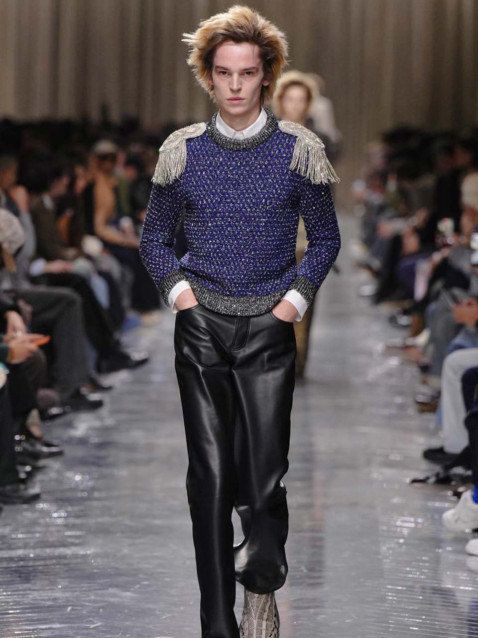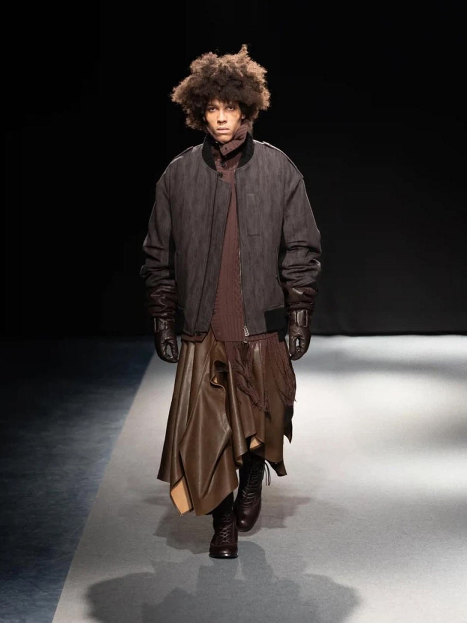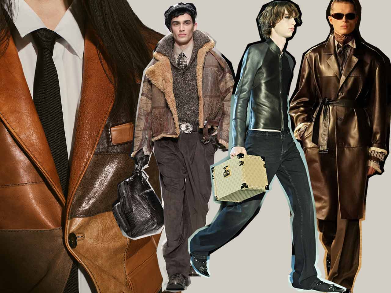 La matière cuir se fait, dans les propositions des créateurs et maisons de luxe pour cet hiver de mode masculine, le support privilégié de toutes les expérimentations, jeux de volumes et de proportions, constructions élaborées qui font et défont les silhouettes de ces garçons, mais un matériau prétexte aussi aux traitements de surfaces les plus diverses : cuir à modeler, à malmener ou à sublimer ! Sur les catwalks le cuir se revendique, s’affirme aussi, avec ses spécificités, ses aspérités, sa grandiloquence, et également son intemporalité.