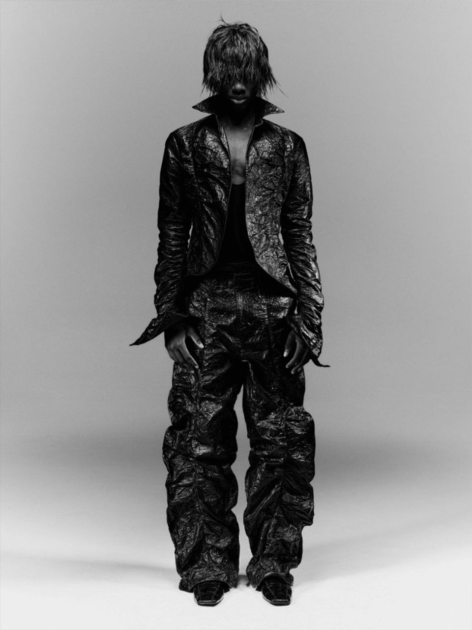 De l’ampleur, du volume, de la rondeur, de l’air, et la matière comme gonflée façon doudoune, matelassée (chez Zegna) ou pas, le cuir se fait ici le matériau de la légèreté, synonyme de « coolitude », avec des propositions tout en disproportions chez Dolce & Gabbana, DSquared2 ou Beautiful People. Esprit « urban wear » avec des combinaisons volumes XXL et un look « néo-bonhomme-Michelin-du-futur » pour Juun.J… Ou pensé dans une approche beaucoup plus couture, comme une revendication sensible d’une filiation entre la vision de Cristóbal Balenciaga et celle de Pierpaolo Piccioli chez Balenciaga, dans cette pré-collection 2026 qui joue sur cette ambivalence du sport et de la couture et dont, là encore, le cuir se fait la matière incontournable. Fluidité avec des pantalons et des pièces qui déstructurent la silhouette, cuir ultra souple traité comme un jogging, résolument loose chez Rowen Rose, et même une version jupe chez Songzio, créateur coréen qui a fait du cuir l’un des matériaux de prédilection de l’ensemble de sa collection.