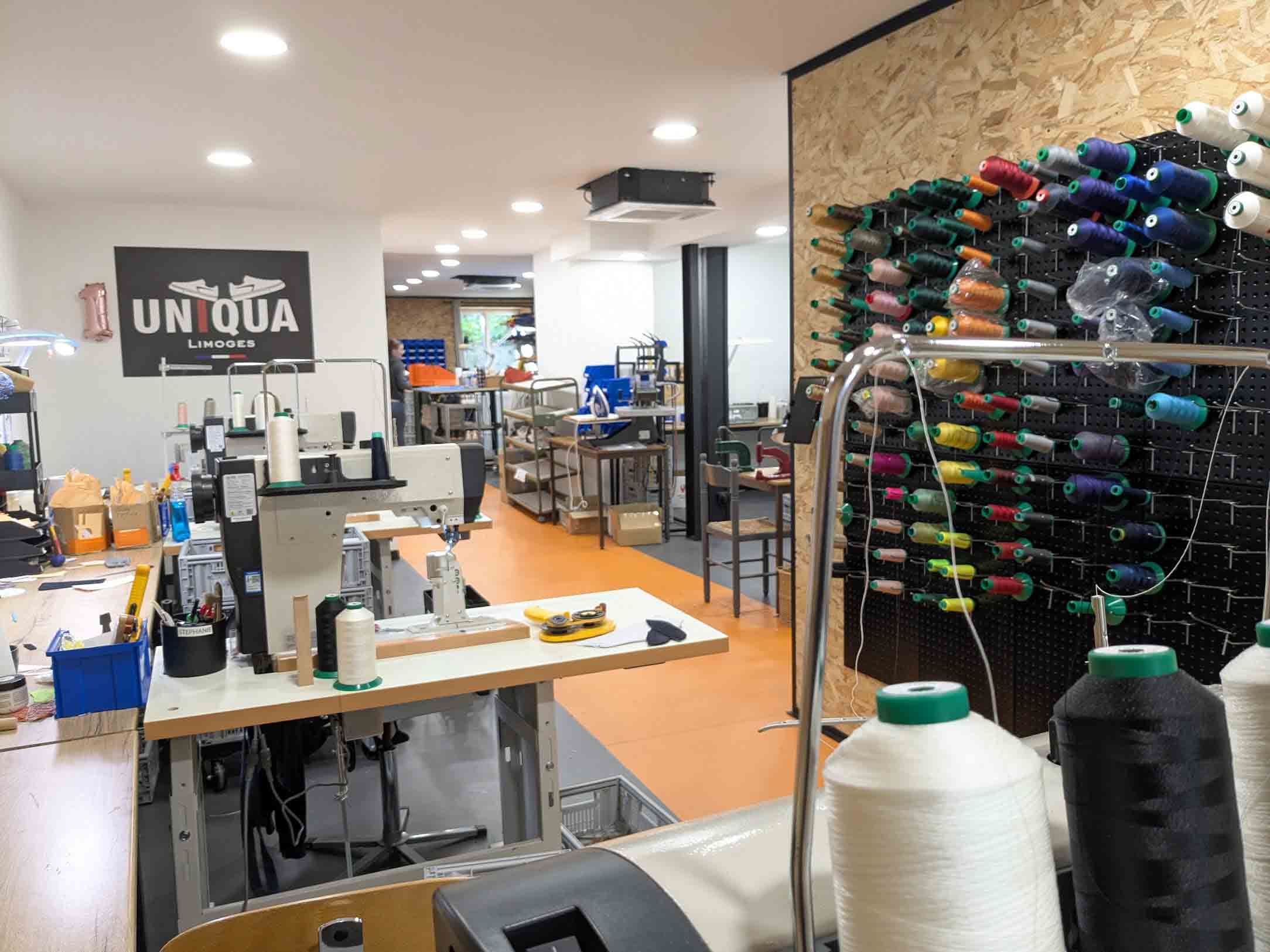 Pour maintenir un prix de vente accessible, à partir de 159 euros, la marque limougeaude mise sur le circuit court et la vente directe : soit au sein de sa boutique-atelier – où les clients peuvent observer en même temps les artisans au travail – soit via son e-shop. « Uniqua est à la fois fabricant et cordonnier, comme l’étaient mes ancêtres », rappelle Julien Jourdanne, qui assure un service de réparation pour ses clients. « Notre fabrication en cousu latéral permet de remplacer facilement les blocs semelles usés. La semelle est en effet la partie qui s’abîme le plus vite sur une basket. Cette activité se développe fortement, car les consommateurs souhaitent de plus en plus prolonger la durée de vie de leurs paires. »